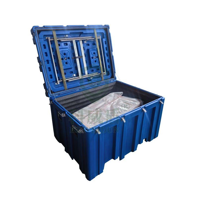 箱體結(jié)構(gòu):運(yùn)輸箱為上開(kāi)蓋結(jié)構(gòu),箱體部分采用滾塑工藝一次成型,箱體裝有鎖扣、合頁(yè)等金屬配件,金屬配件均為304不銹鋼材質(zhì)。